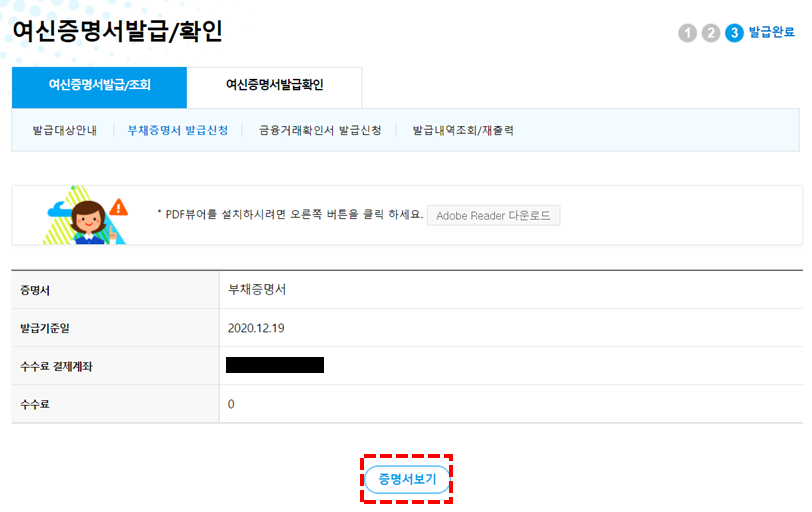 ■ 발급 완료 화면에서 "증명서보기" 클릭하여 출력 또는 PDF 파일로 저장 가능하다.