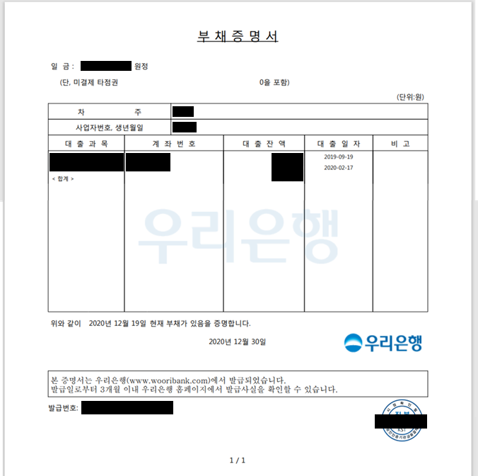 나는 올해 초에 신청했던 신용대출 금액 중 일부를 주택 구입에 사용하게 되어, 기존 대출 내역에 대한 부채증명서를 준비하였다.